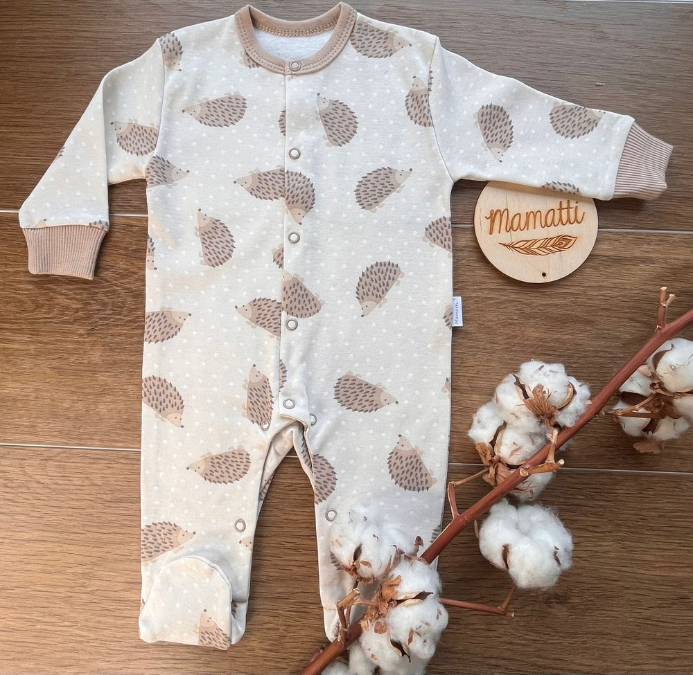 - Pajacyk niemowlęcy Mamatti PA15740 jeżyki. Bawełniany, ze stópkami, zapinany na napy.