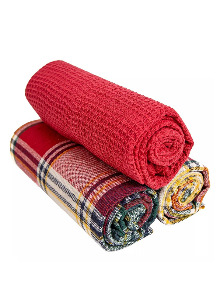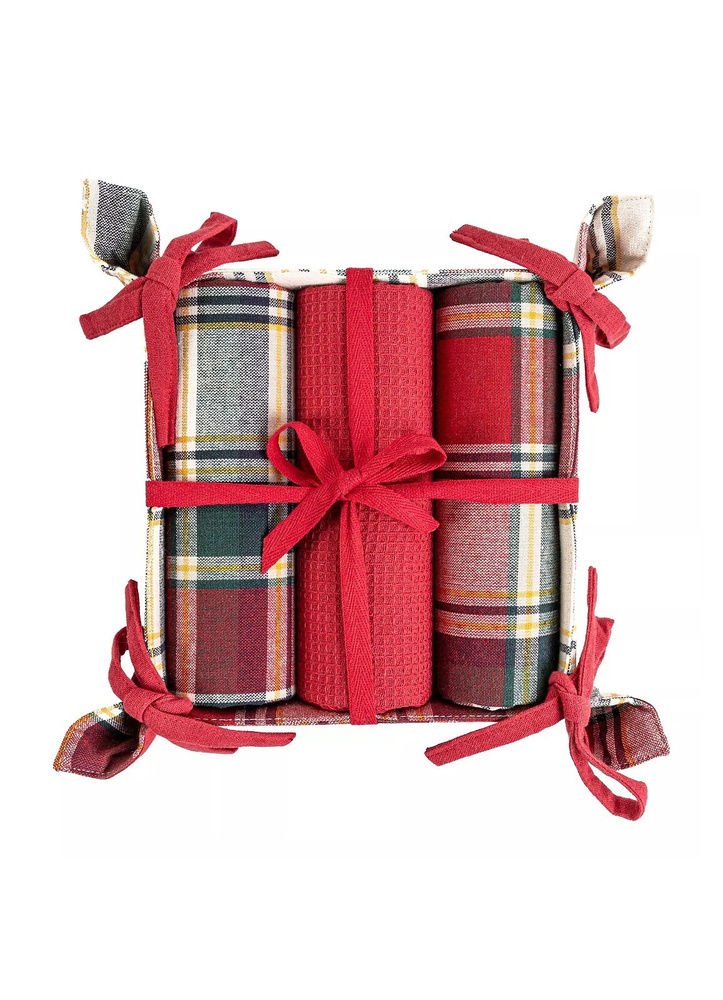 W komplecie znajdują się dwie ściereczki ozdobione delikatnym wzorem w kratkę oraz jedna jednolita o strukturze wafla. Taki zestaw doskonale komponuje się z wystrojem każdej kuchni, nadając jej ciepły i przytulny charakter. Całość zapakowana jest w ozdobny, materiałowy koszyczek, który można wykorzystać również jako praktyczny organizer.
