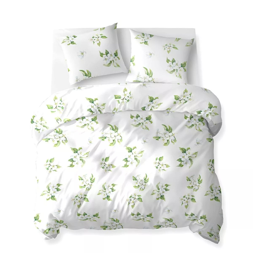 5766 B Pościel bawełniana Cotton Bloom Detexpol biała w białe kwiaty z zielonymi liśćmi – 100% bawełna, dwustronna, polska produkcja