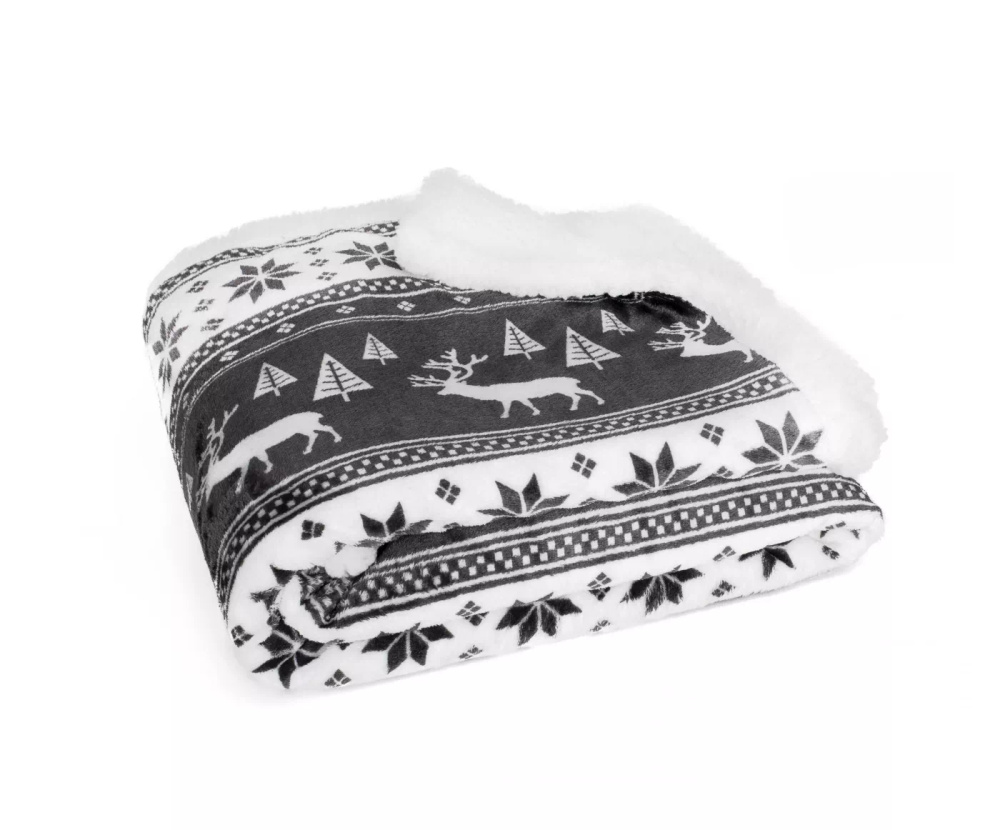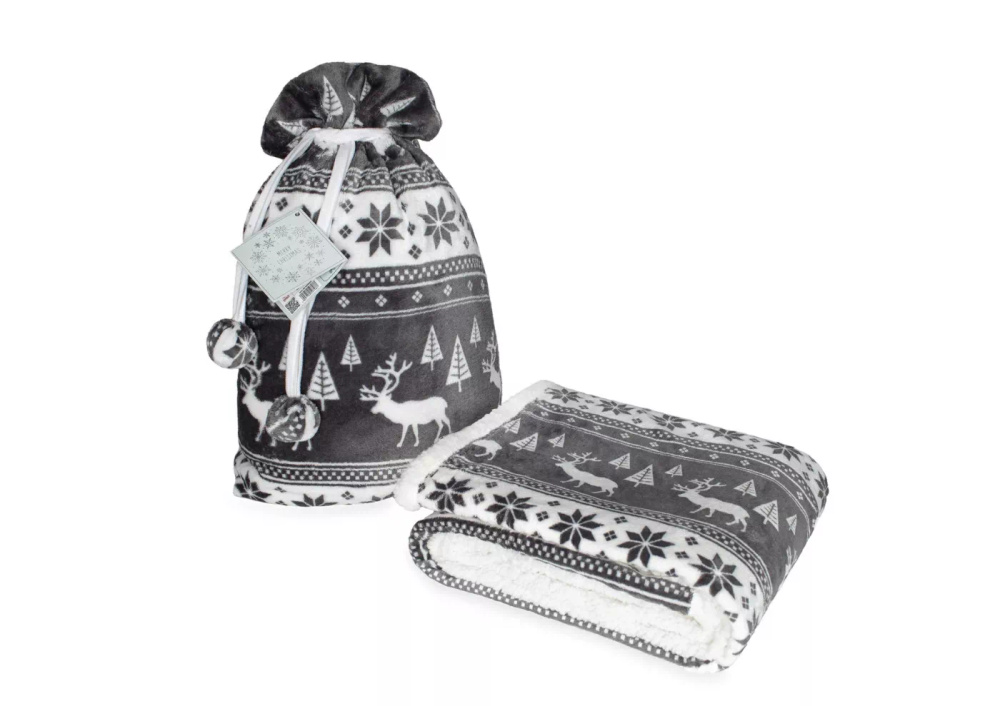 Koc świąteczny SACO popielaty – miękki i ciepły z reniferami i choinkami w ozdobnym worku
