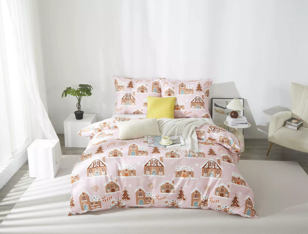 Gingerhouse Pościel mikrosatynowa świąteczna piernikowe domki różowa I25 Spod Igły i Nitki – miękka, gładka i trwała