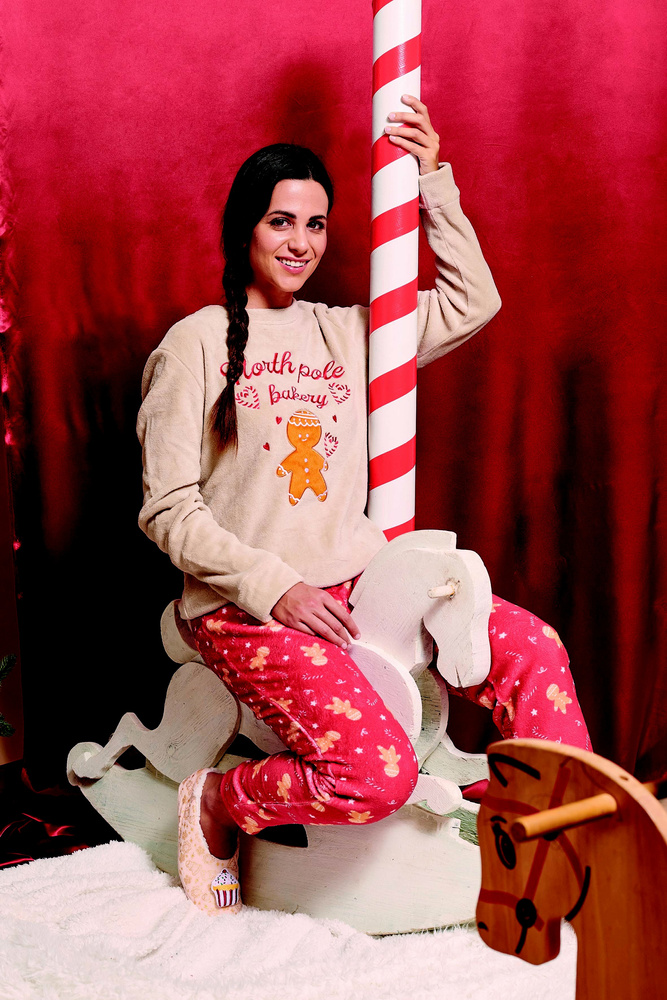 - Piżama Meddy Sorbetto z miękkiego polaru coral fleece otuli Cię w świątecznym stylu. Bluza z konikiem na biegunach i napisem „Ginger Horse”, spodnie z motywem pierniczków i lasek cukrowych