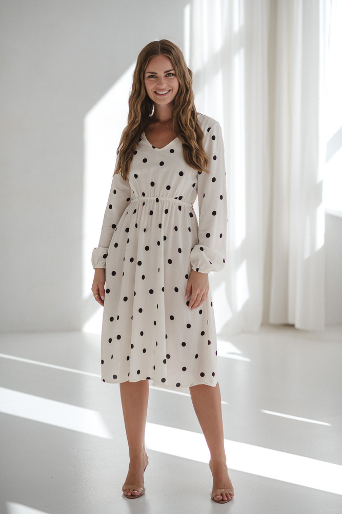 Lovely Dress Midi Milk&Love kremowa w grochy– sukienka ciążowa i do karmienia z lnem, elegancki krój z zamkami do karmienia