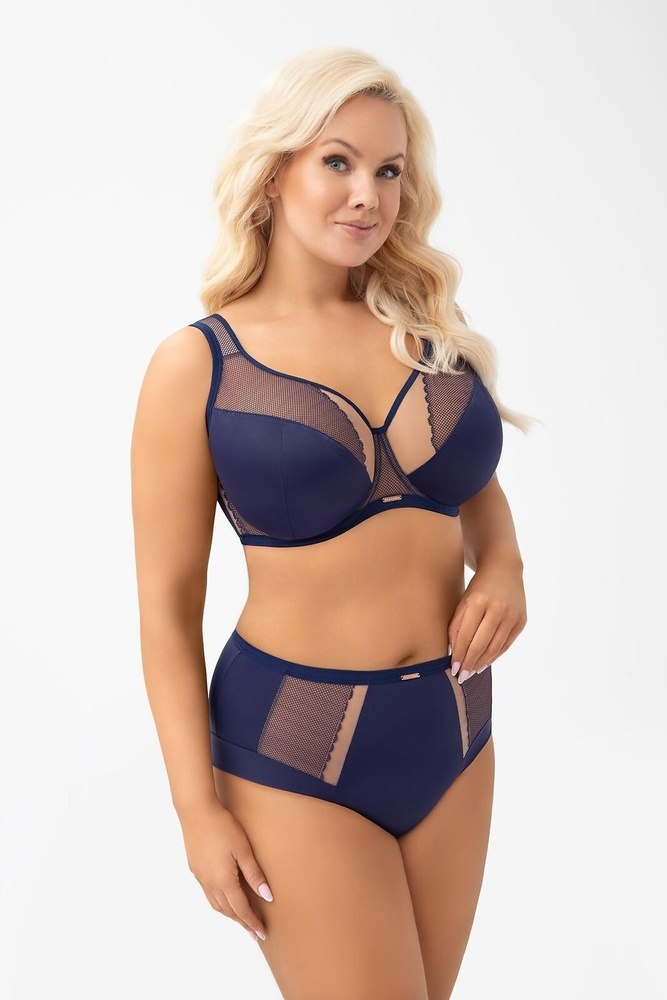 Granatowy biustonosz Luisse świetnie wygląda pod ciemnymi bluzkami, sukienkami i eleganckimi koszulami. Do kompletu dobierz granatowe figi lub stringi Gorsenia.