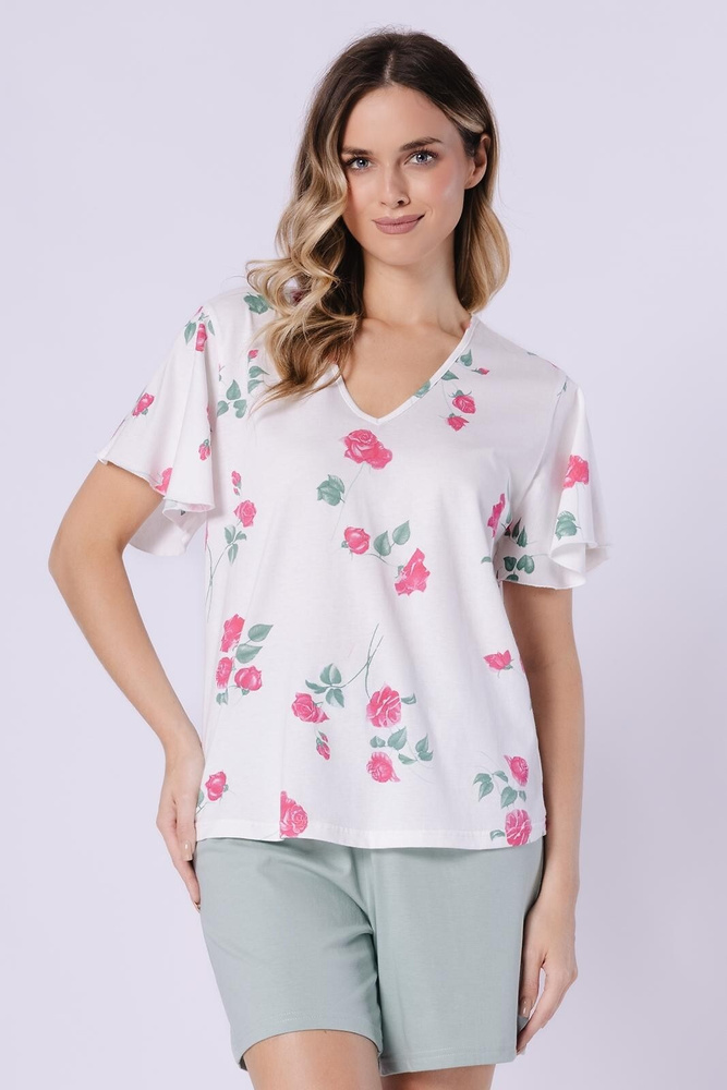 Piżama damska bawełniana Vivian Leveza 1725 śmietankowy– lekka piżama na lato, koszulka motylek + krótkie spodenki