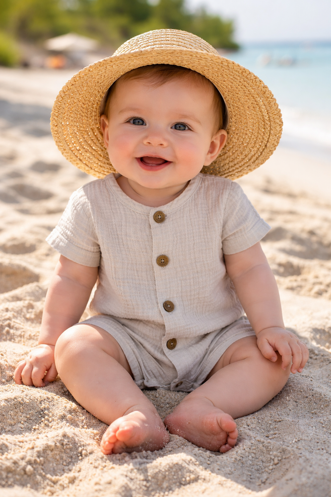 • Lekki rampers muślinowy dla niemowląt na ciepłe dni. Naturalna bawełna, swobodny krój i wygodne guziki. Idealny na lato i codzienne aktywności – sprawdź teraz.
