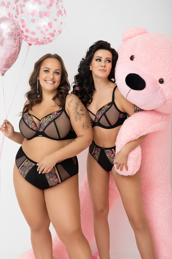 Trójdzielne miseczki wykonane z czarnego tiulu podszytego beżową siateczką skutecznie modelują piersi i nadają im naturalny, zaokrąglony kształt. W górnej linii miski zastosowano kolorowy haft o kwiatowym motywie, który dodaje lekkości i kobiecego charakteru. Konstrukcja została zaprojektowana tak, aby górna krawędź miski płynnie przechodziła w ramiączko, co znacząco poprawia podtrzymanie i stabilność biustu.