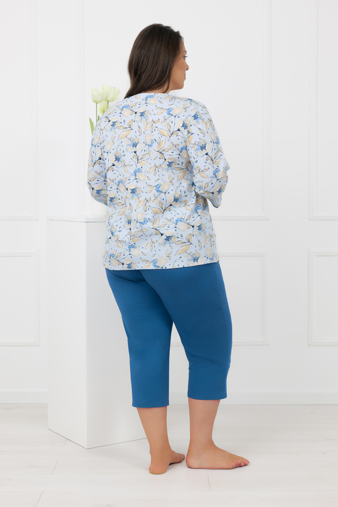 Górę kompletu stanowi bluzka zapinana na guziki, z rękawami 3/4 oraz dekoltem w kształcie litery V, który optycznie wysmukla górną część sylwetki i zapewnia swobodę noszenia. Delikatny, pastelowy motyw kwiatowy dodaje całości lekkości i świeżości, a praktyczne kieszenie po bokach zwiększają komfort użytkowania – idealne na drobiazgi lub po prostu dla wygody. Spodnie o długości 3/4, utrzymane w jednolitym kolorze, zostały wyposażone w miękką gumę w tunelu, która nie uciska i dobrze dopasowuje się do talii.