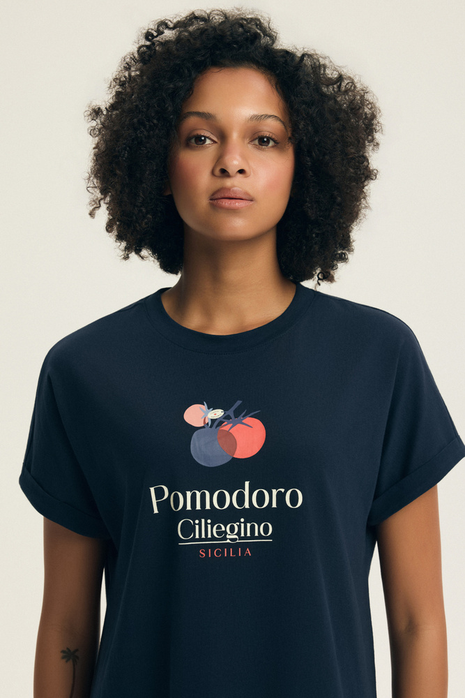 • Naturalna bawełna, luźny krój i oryginalny print z pomidorem. Wygodna koszula nocna do snu i domowego relaksu.