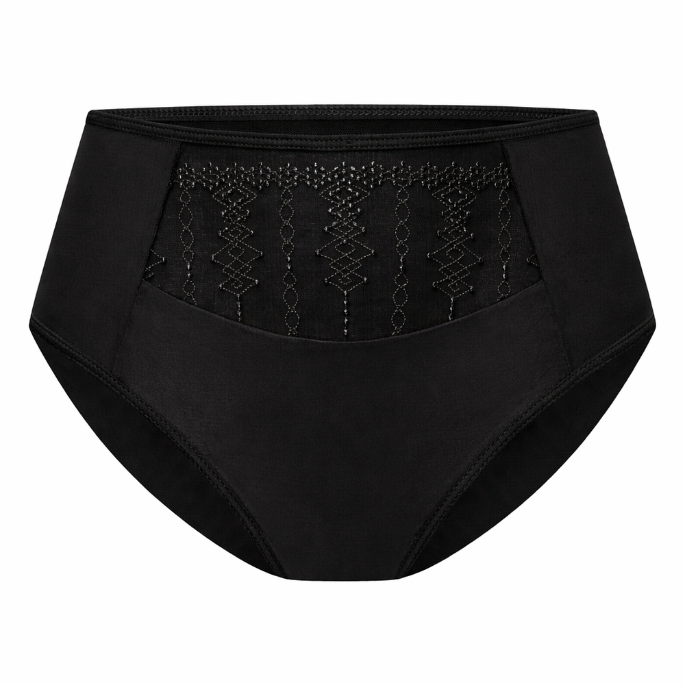 Figi zostały zaprojektowane z myślą o stabilnym dopasowaniu do sylwetki bez uczucia ucisku. Przód wykonano z gładkiej, elastycznej dzianiny, która miękko układa się na ciele i dobrze sprawdza się pod dopasowaną odzieżą. Górna część została subtelnie ozdobiona delikatnym haftem, który nawiązuje stylistycznie do biustonosza z tej samej linii. Tył i boki zachowują lekkość i komfort noszenia, dzięki czemu figi są odpowiednie zarówno na cały dzień, jak i na bardziej wyjątkowe okazje.