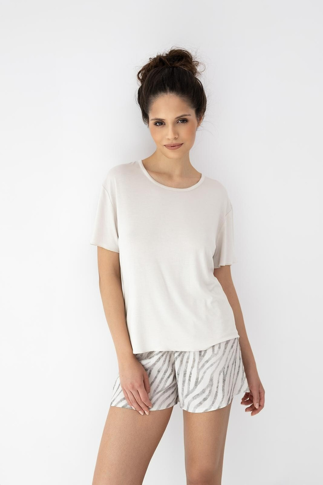 Koszulka została wykonana z wysokiej jakości dzianiny wiskozowej (95% wiskoza, 5% elastan). Wiskoza jest miękka, oddychająca i przyjemnie chłodna w dotyku, dlatego świetnie sprawdza się jako piżama na ciepłe dni. Dodatek elastanu poprawia elastyczność i dopasowanie do sylwetki. Krótki rękaw oraz półokrągły dekolt tworzą klasyczną, uniwersalną linię, która dobrze układa się na ciele i nie uciska.