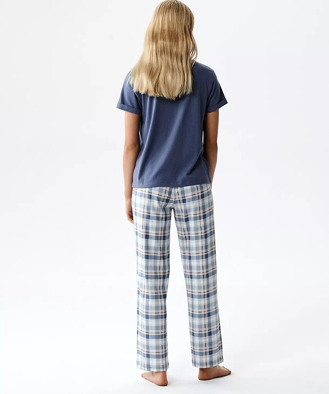 Górę zestawu stanowi koszulka z krótkim rękawem i okrągłym dekoltem, która naturalnie układa się na sylwetce. Na przodzie znajduje się subtelny napis, który nadaje modelowi nowoczesnego charakteru. Prosty krój sprawia, że koszulka jest wygodna zarówno do spania, jak i do codziennego domowego relaksu.