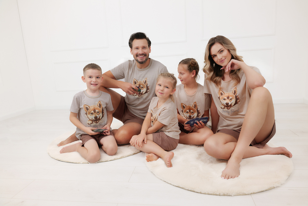Koszulka ma klasyczny fason z krótkim rękawem i okrągłym dekoltem. Nie opina ciała, dzięki czemu nie ogranicza ruchów podczas snu ani zabawy. Wyrazisty nadruk z pieskiem rasy shiba oraz napis „family friend” nadaje całości wesołego i swobodnego charakteru.