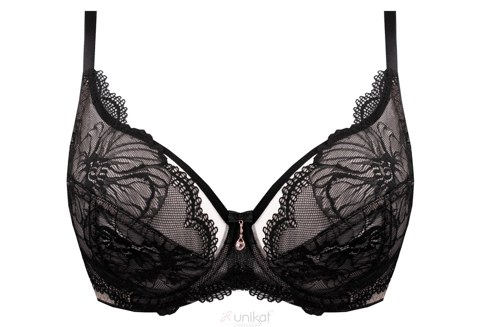Konstrukcja oparta na miękkich miseczkach z transparentnej siateczki i eleganckiej koronki pozwala dopasować się do kształtu piersi, jednocześnie je zbierając i stabilizując. Dolna część miseczki wzmacnia podtrzymanie, a górna – bardziej elastyczna – dopasowuje się do naturalnej linii biustu. Dzięki temu biust wygląda lekko, naturalnie i proporcjonalnie.
