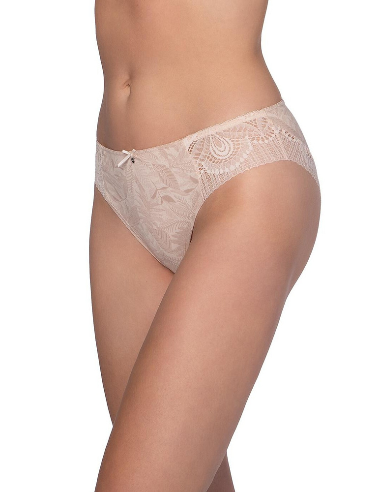 Figi zostały wykonane z wysokiej jakości bawełny z dodatkiem elastanu (95% bawełna, 5% elastan), dzięki czemu są miękkie, elastyczne i dobrze dopasowują się do ciała bez ucisku. Przód łączy gładką i wzorzystą bawełnę, co nadaje im subtelnego charakteru, natomiast tył wykończony ażurową koronką dodaje lekkości i kobiecego wyglądu, nie rezygnując z wygody.