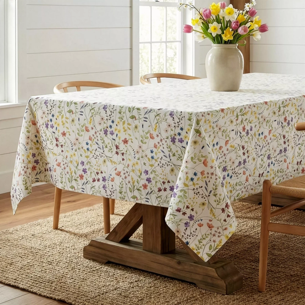 Ten obrus w kwiaty doskonale wpisuje się w styl klasyczny, romantyczny i nowoczesny – możesz zestawić go z białą zastawą, pastelowymi dodatkami lub naturalnym drewnem, tworząc spójną i przyjemną przestrzeń do wspólnych posiłków. Dla najlepszego efektu warto dobrać rozmiar tak, aby obrus zwisał ok. 20–30 cm z każdej strony stołu – zapewni to eleganckie wykończenie aranżacji.