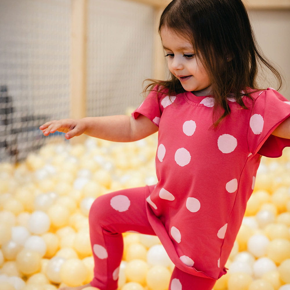 Motylkowe rękawki dodają delikatnego, dziewczęcego charakteru, a intensywny malinowy kolor sprawia, że bluzka wygląda świeżo i modnie. Sprawdzi się zarówno na co dzień, do zabawy w domu, jak i na świeżym powietrzu. Idealnie komponuje się z casualowymi stylizacjami – legginsami, spódniczkami czy jeansami.