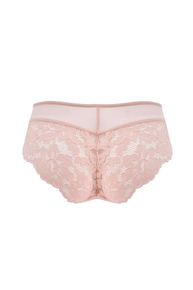 Model wykonany jest z transparentnej, lekkiej siateczki, która delikatnie otula ciało i dopasowuje się do jego kształtu, nie powodując ucisku. Centralny panel z kwiatowej koronki wizualnie modeluje sylwetkę i dodaje całości eleganckiego charakteru. Koronkowe wykończenie przy nogawkach sprawia, że figi nie odznaczają się pod ubraniem, co czyni je dobrym wyborem pod sukienki, spodnie czy spódnice. Pudrowy kolor podkreśla subtelność i kobiecy styl.