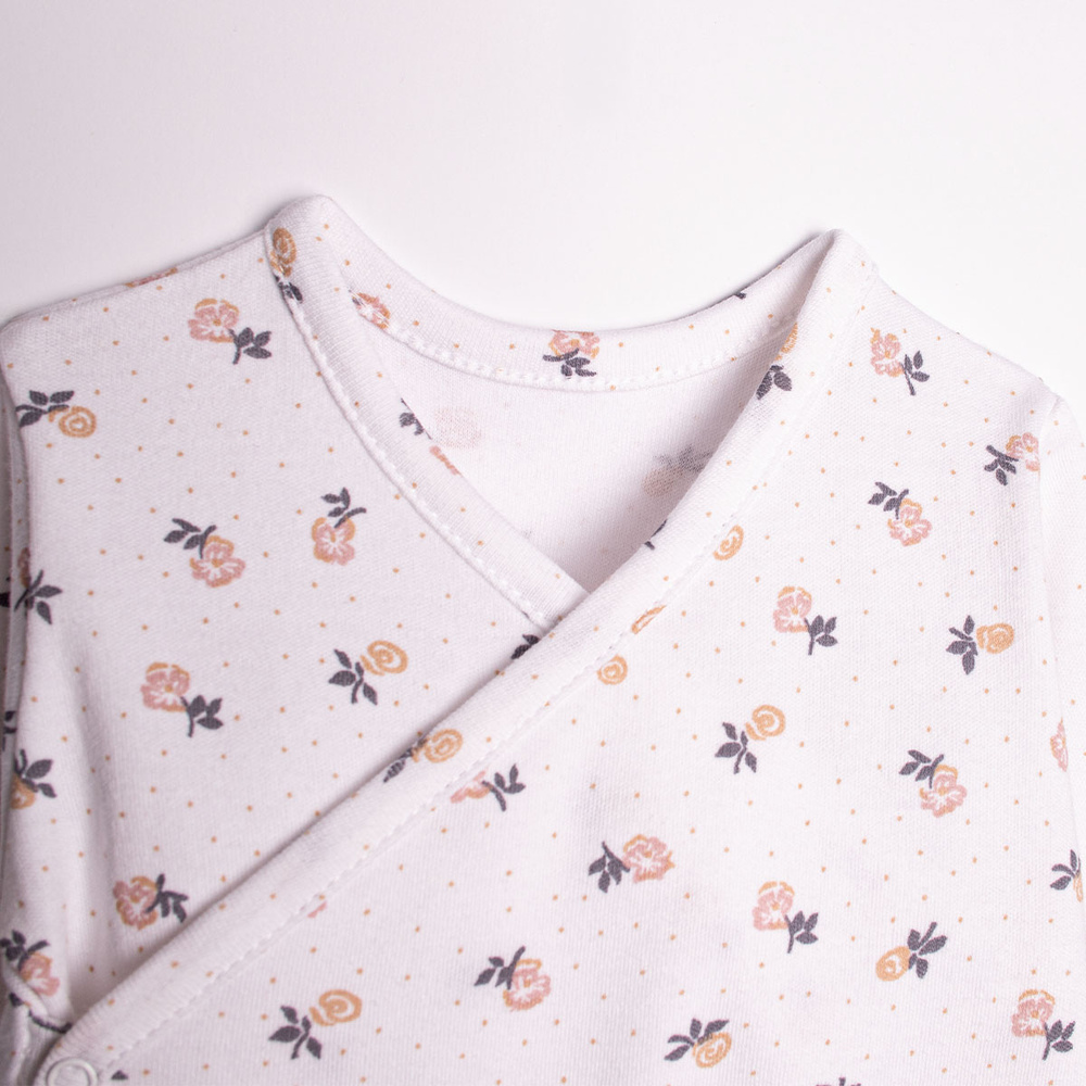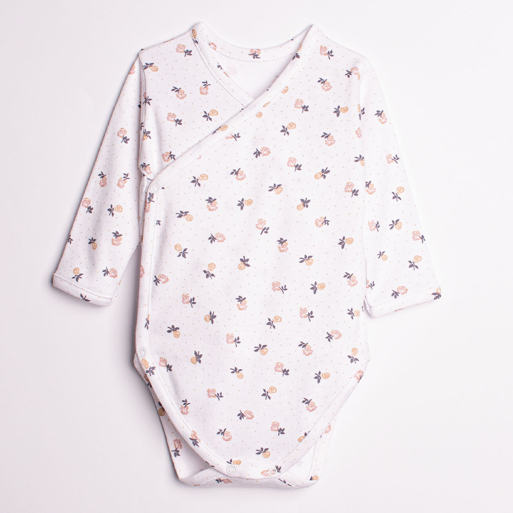 - Urocze body z długim rękawem dla dziewczynki, wykonane z wysokiej jakości bawełny z uroczym kwiatowym nadrukiem. Dzięki zapięciom na bezniklowe napy, zakładanie i zdejmowanie ubranka jest łatwe i szybkie.