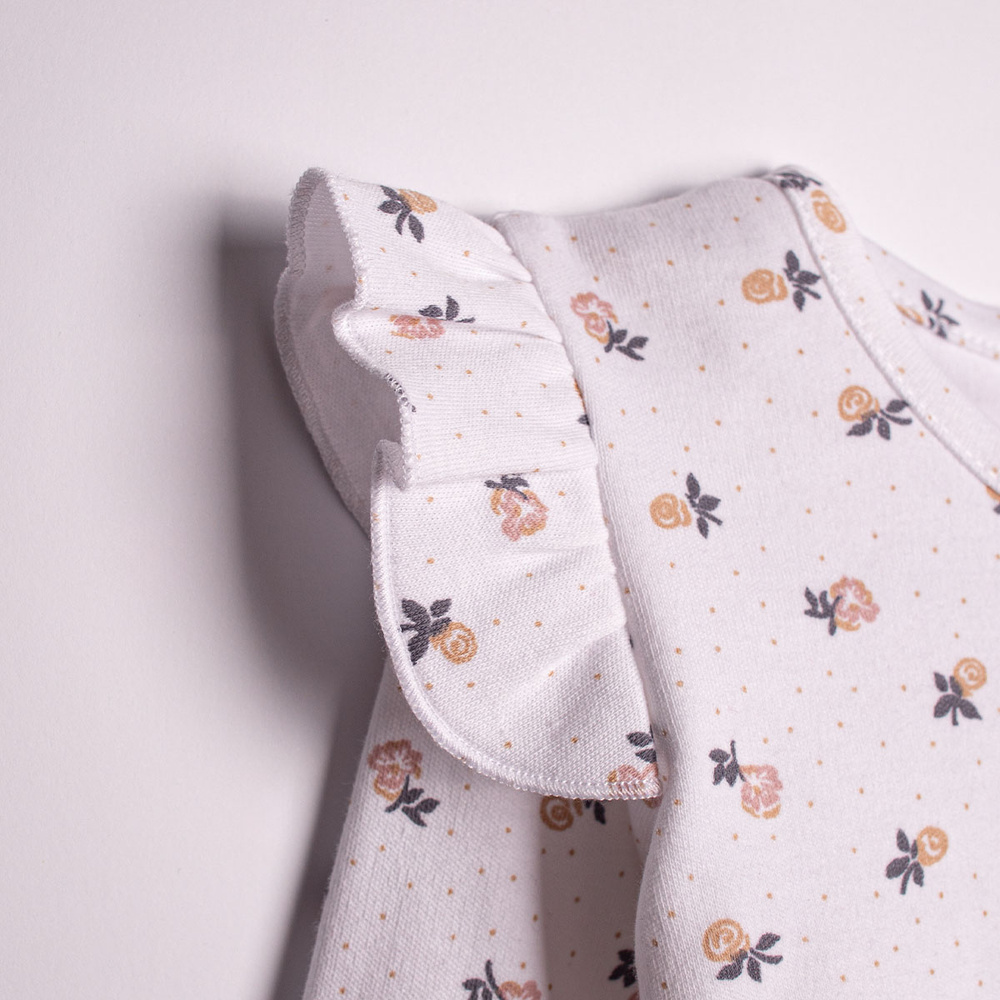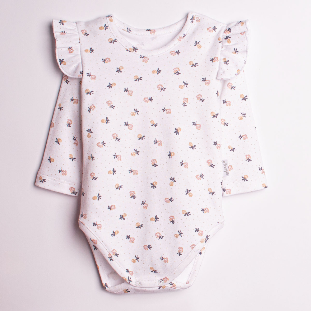 - Piękne body dla dziewczynki z długim rękawem Nicol, uszyte w 100% z bawełny, z uroczym kwiatowym nadrukiem i ozdobnymi motylkami na rękawkach. Zapinane na bezniklowe napy na ramieniu i w kroku. Idealne na każdą okazję.
