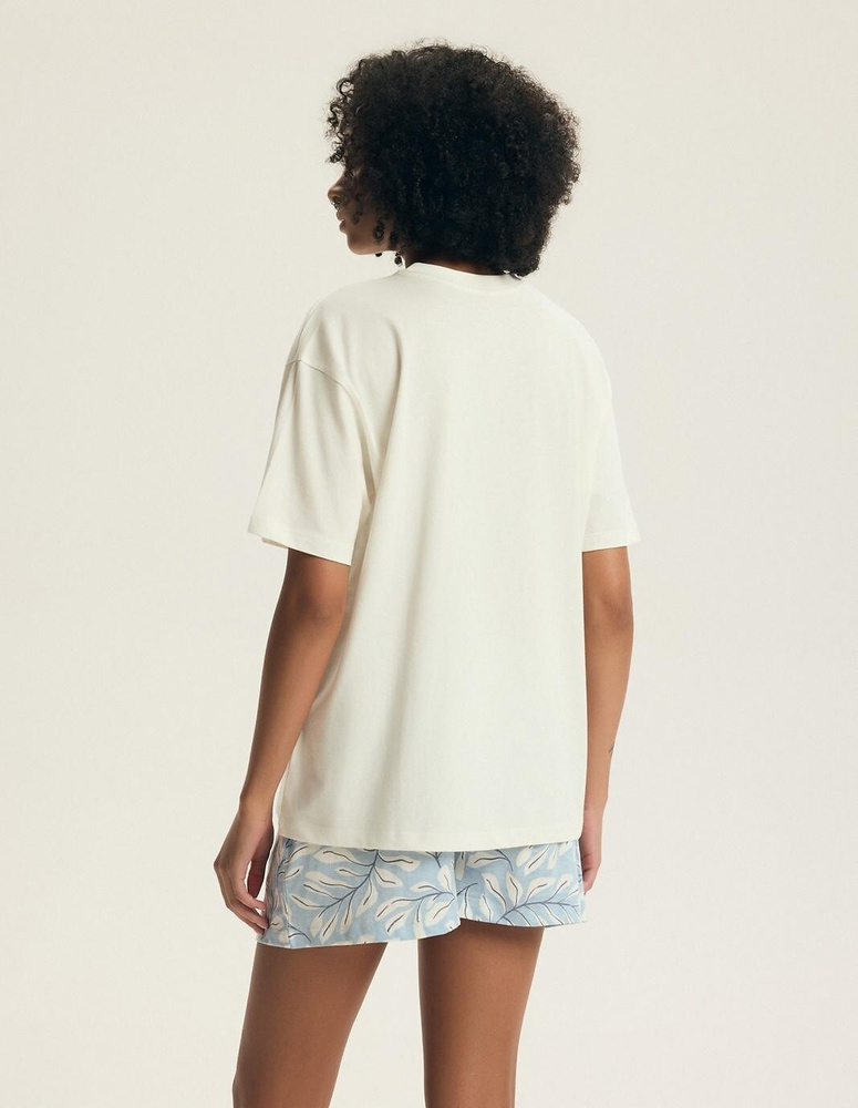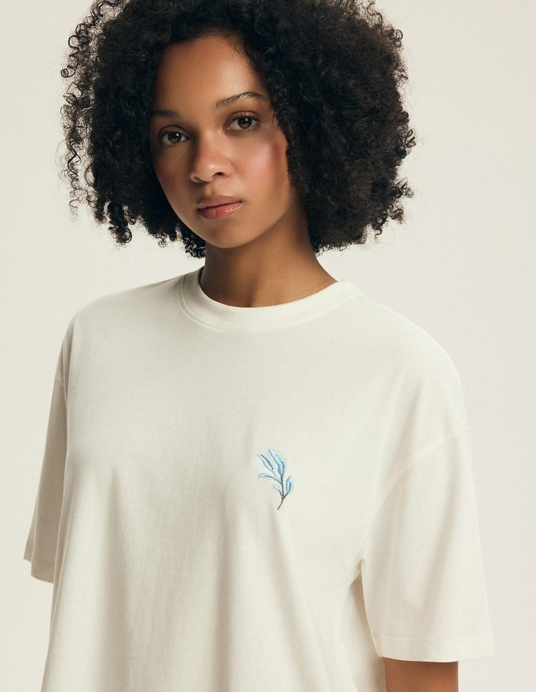 Piżama posiada bawełnianą koszulkę z półokrągłym dekoltem, haftem roślinnym oraz krótkie spodenki z szerokim, wygodnym pasem.