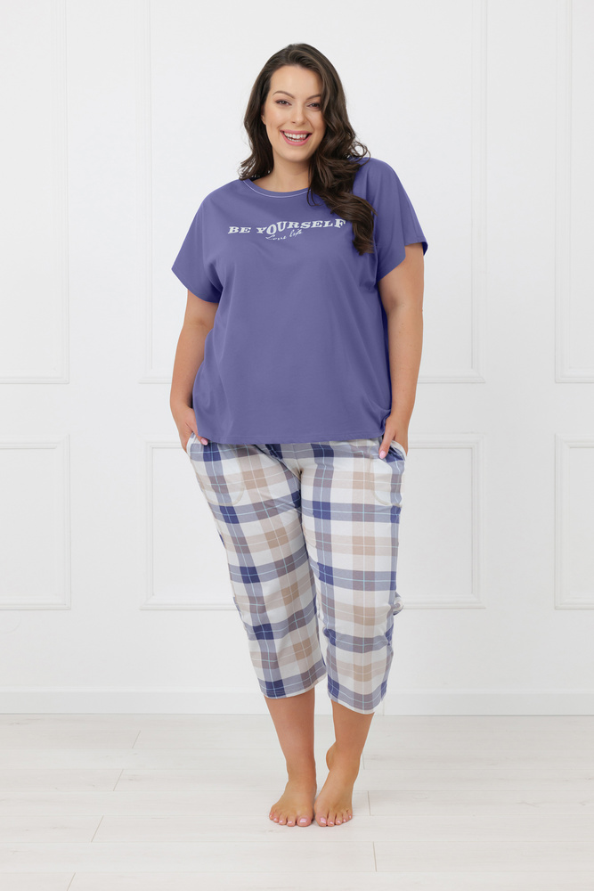 Spodnie 3/4 z klasycznym motywem kraty tworzą spójny, estetyczny kontrast z jednolitą górą. Elastyczna, miękka guma w pasie dobrze dopasowuje się do sylwetki bez ucisku, co ma znaczenie podczas snu i odpoczynku. Luźniejszy krój sprawia, że model sprawdzi się zarówno dla kobiet preferujących bardziej swobodną odzież nocną, jak i tych, które szukają praktycznej piżamy do codziennego użytkowania w domu.