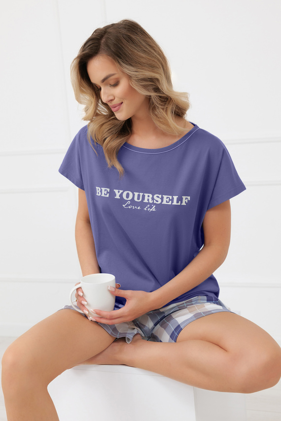 Piżama została wykonana z certyfikowanej bawełny o gramaturze 140 g/m², dzięki czemu jest przyjemna dla skóry, lekka i zapewnia odpowiednią cyrkulację powietrza. Górę stanowi gładka bluzka o prostym, swobodnym kroju z delikatnym dekoltem typu łódka, który subtelnie podkreśla linię szyi. Nadruk „BE YOURSELF” nadaje całości nowoczesnego, ale nienachalnego charakteru.