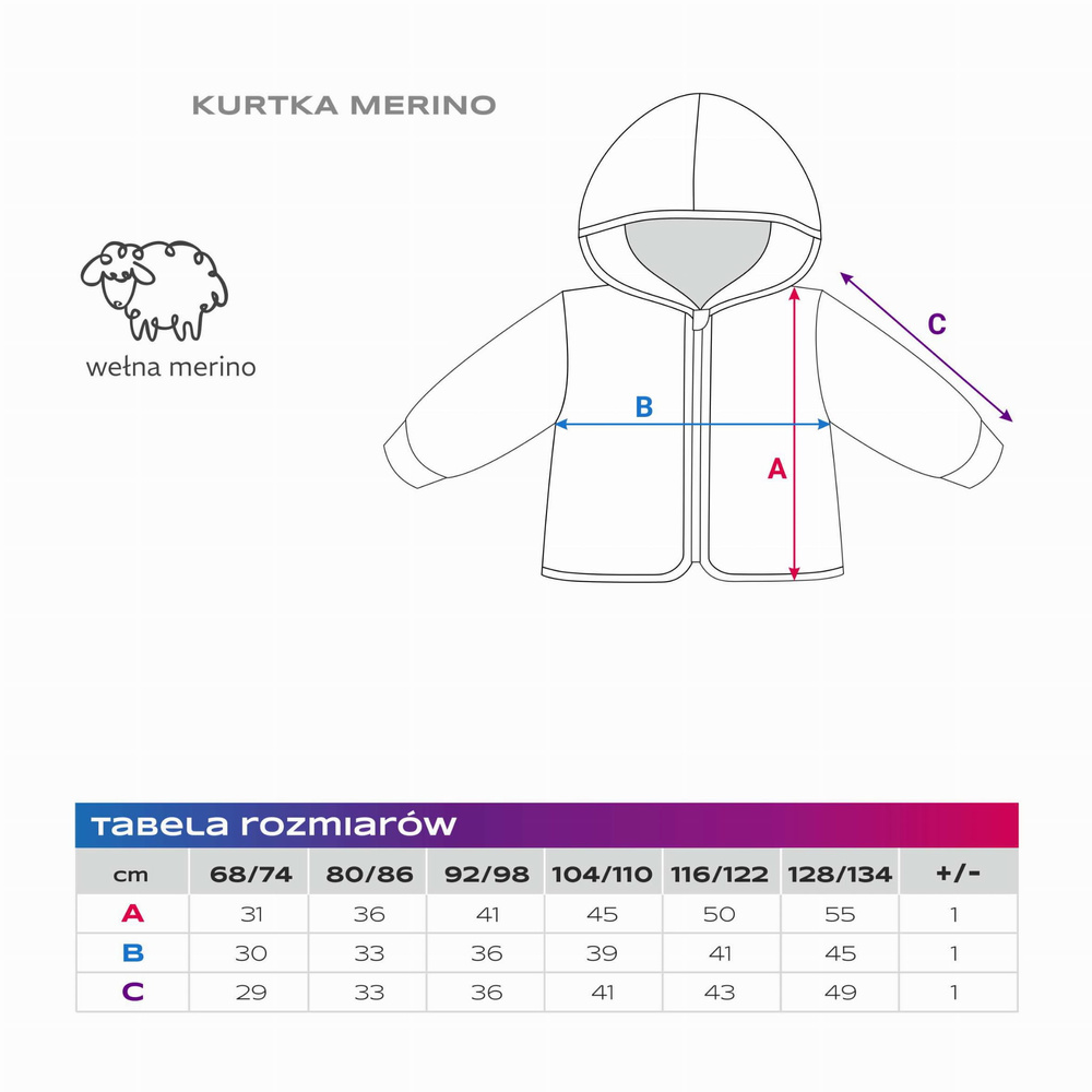 Kurtka została wykonana w 100% z naturalnej wełny merino o gramaturze 285 g/m², która znana jest ze swoich właściwości termoregulacyjnych. Materiał ogrzewa, gdy temperatura spada, a jednocześnie odprowadza nadmiar wilgoci, dzięki czemu dziecko pozostaje suche i czuje się komfortowo nawet podczas aktywności. To rozwiązanie idealne na spacery, drogę do przedszkola czy wyjazdy.