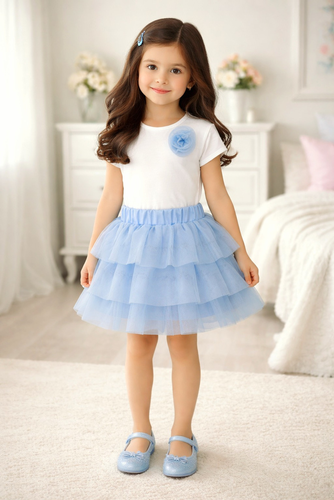 Spódniczka została wykonana z delikatnego tiulu, który tworzy lekko rozkloszowaną formę i nadaje stylizacji objętości, jednocześnie pozostając lekkim i przewiewnym. Podszewka zapewnia komfort noszenia i chroni skórę dziecka przed podrażnieniami. Elastyczna talia dobrze dopasowuje się do sylwetki, dzięki czemu spódniczka nie uciska i pozostaje wygodna przez cały dzień.