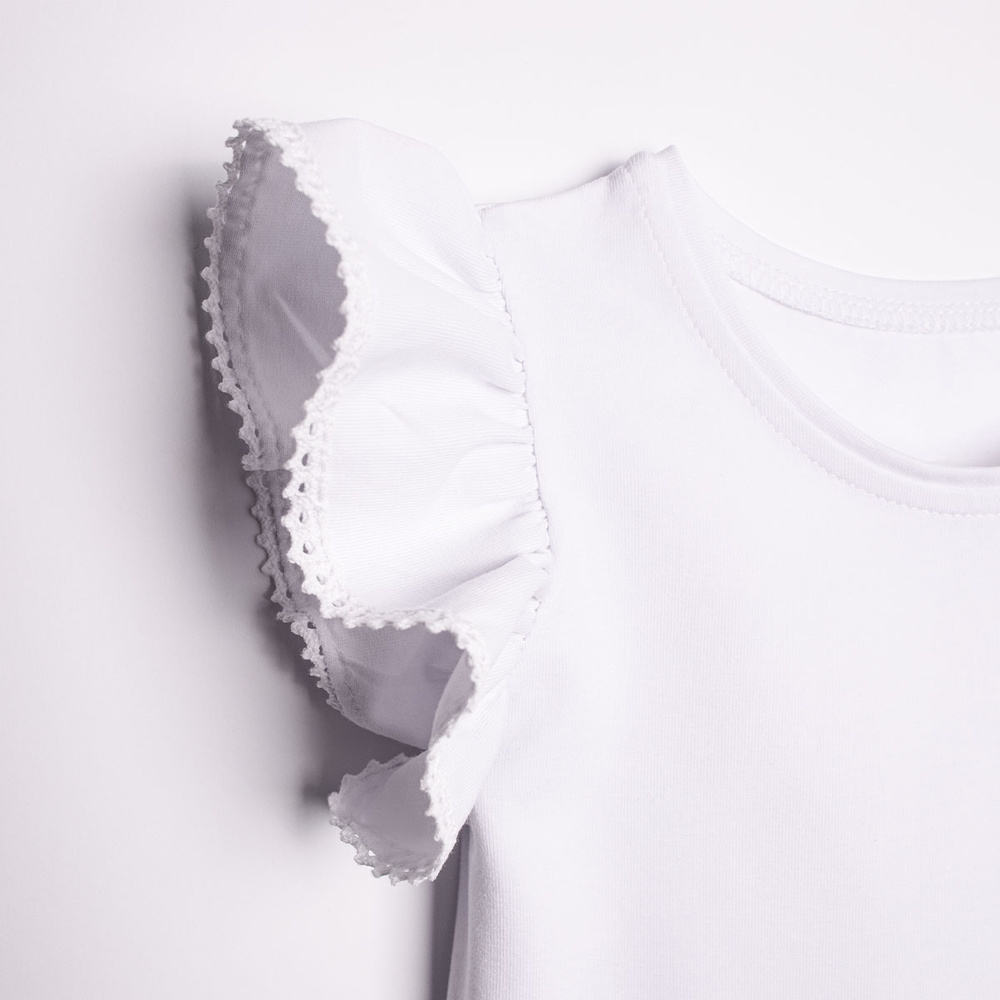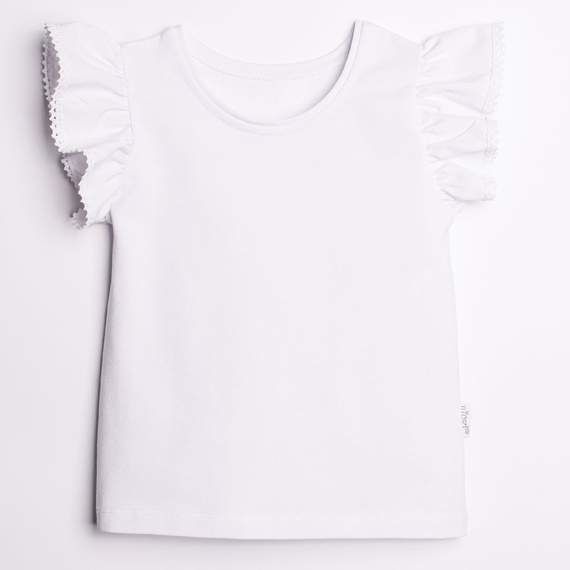 Charakterystycznym elementem są rękawki typu motylki, delikatnie marszczone na całej długości i wykończone subtelną bawełnianą koronką. To właśnie te detale nadają bluzce lekkości i dziewczęcego uroku. Biały kolor sprawia, że łatwo dopasować ją do wielu stylizacji – od eleganckich zestawów ze spódniczką, po casualowe outfity z legginsami czy jeansami.