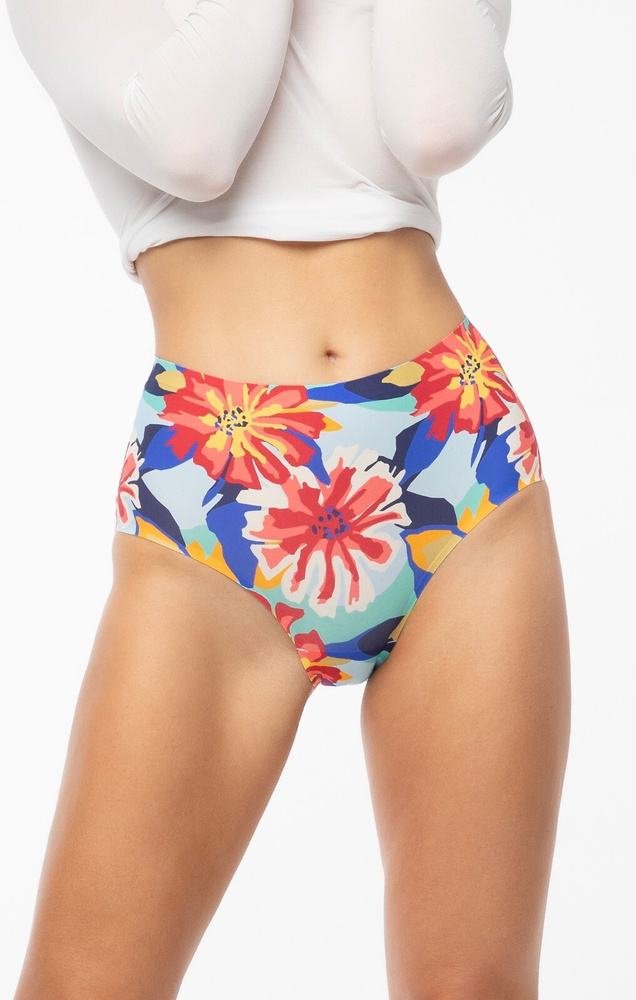 Figi zostały wykonane z delikatnej mikrofibry z kolorowym, kwiatowym printem, która jest miękka, elastyczna i przyjazna dla skóry. Krój maxi z wyższym stanem zapewnia lepsze dopasowanie w okolicach brzucha i bioder, a szersze, pełniejsze boki zwiększają komfort noszenia i stabilność. To model, który dobrze trzyma się na ciele i nie przesuwa się w ciągu dnia.