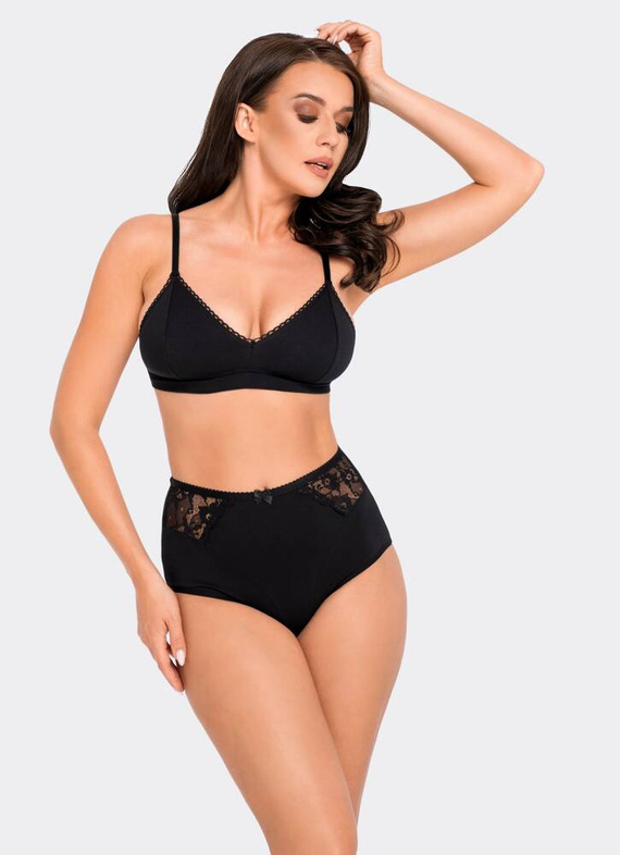 Wysokie figi damskie o klasycznym kroju. Model z delikatnej bawełny. Z przodu subtelny pas z delikatnej koronki, tył gładki. Gumka w pasie od wewnętrznej strony z sylikonem. Model pakowany w pudełko. Szczególną zaletą tego modelu jest wysokiej jakości dzianina bawełniana z dodatkiem lycra, przez co idealnie dopasowują się do ciała. Jest to materiał doskonale oddychający i przewiewny.