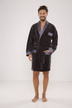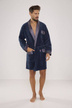 Krótki welurowy szlafrok męski, z szalowym kołnierzem, wiązany na pasek, z dwoma naszytymi kieszeniami i jedną mniejszą na wysokości klatki piersiowej. Mankiety, kołnierz i kieszenie wykończone wzorzystą satyną. Jest on wykonany z 80% bawełny przyjemnej w dotyku idealnie wchłaniającej wodę.