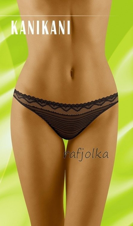 Eleganckie stringi wykonane z wzorzystej siateczki. Tył ozdobiony efektownym sznurowaniem z satynową kokardką. Skład: 83% poliamid, 17% elastan.