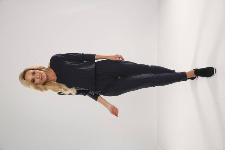 Kombinezon damski z rękawem o długości 7/8. Wiązany na szyi, z efektownym rozcięciem w kształcie łezki. W talii gumka podkreślająca sylwetkę. Na wysokości bioder kieszenie. Nogawki delikatnie zwężane. Modny, luźny fason zapewnia wygodę i komfort podczas aktywnego dnia.