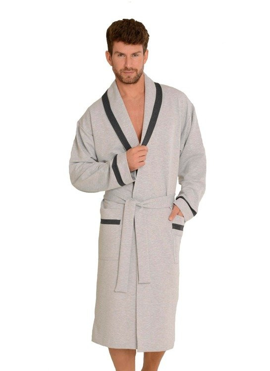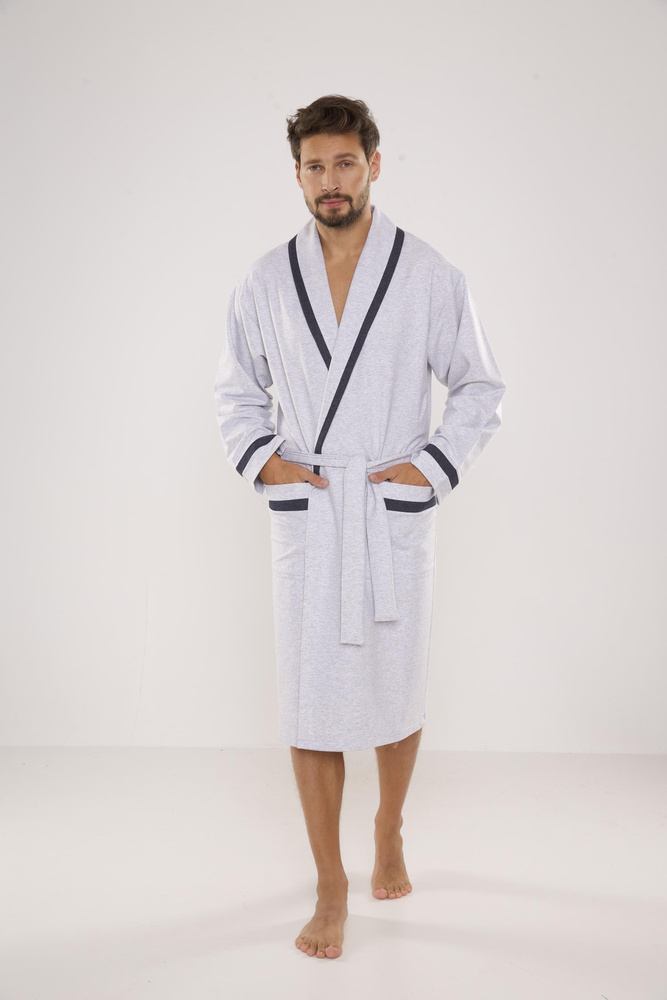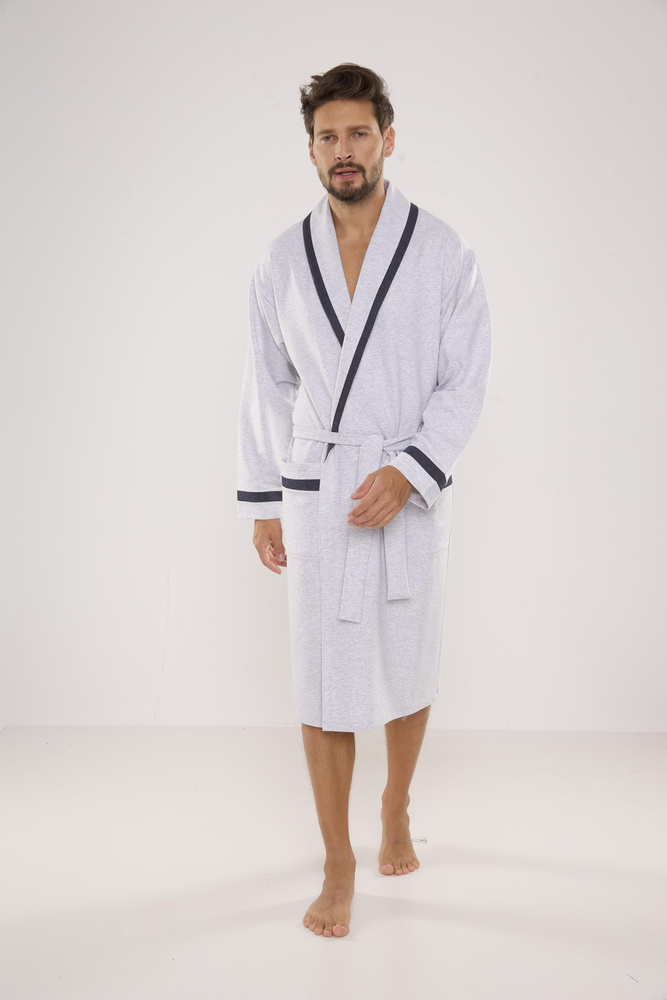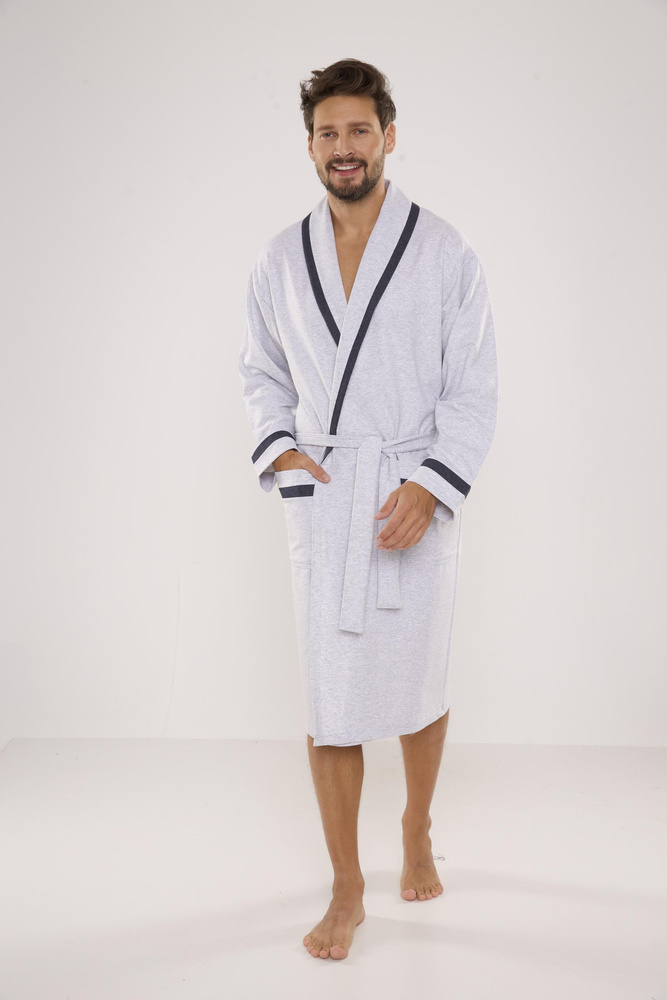 Mamy do zaoferowania ekskluzywny długi szlafrok z kołnierzem, wiązany w pasie.