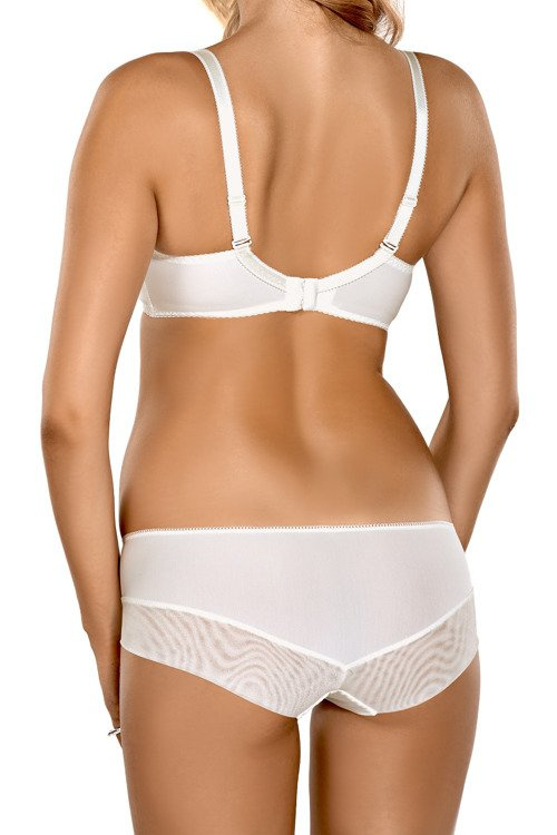 Szorty damskie z delikatnej mikrofibry w kolorze milk - ecru. Przód zdobi wstawka z siateczki ozdobionej efektownym haftem. Tył z mikrofibry i podwójnego tiulu.