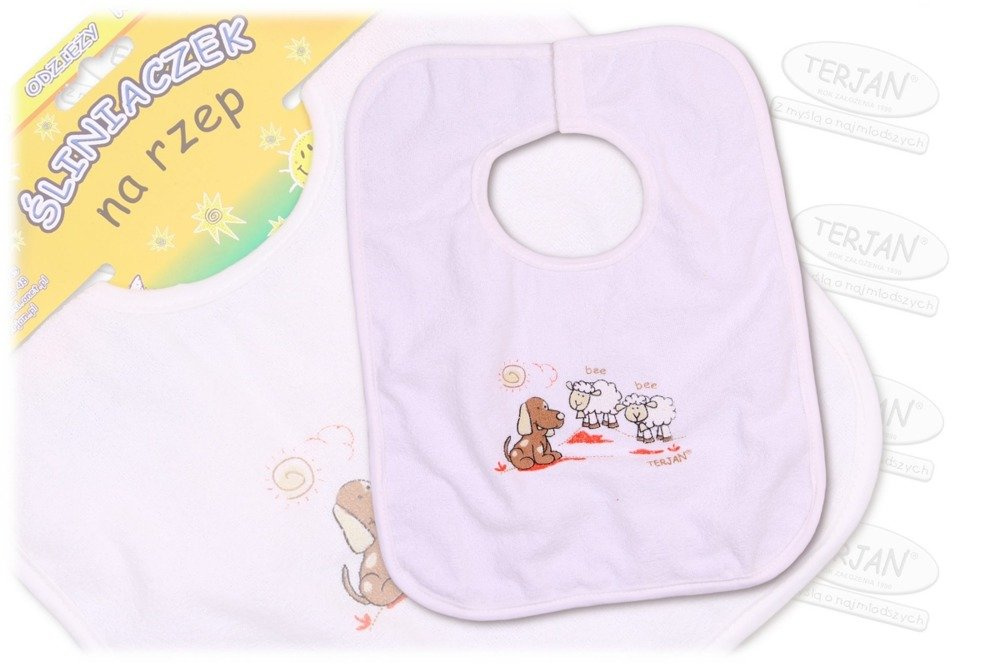 Śliniaczek zamiast tradycyjnego wiązania posiada praktyczne zapinanie na rzep.