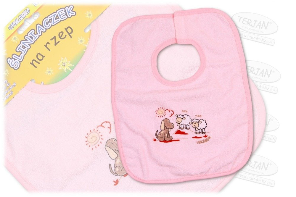 Śliniaczek zamiast tradycyjnego wiązania posiada praktyczne zapinanie na rzep.