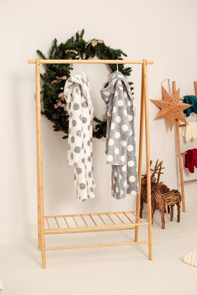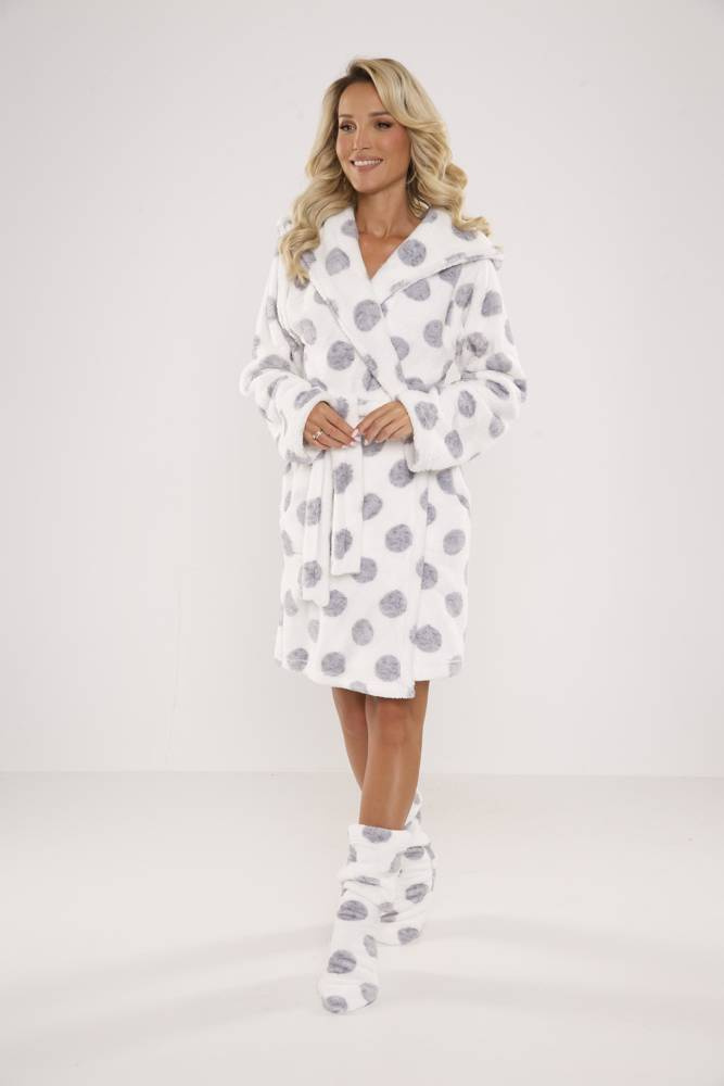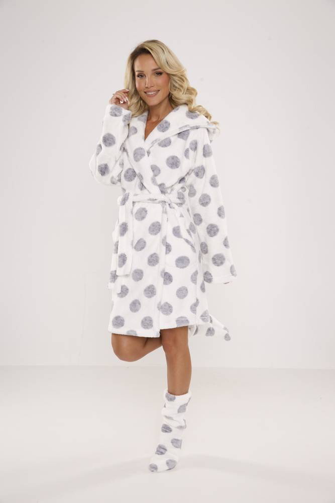 Krótki szlafrok damski z kapturem, z miękkiej dzianiny typu soft w duże kropki. Wiązany w pasie, z kieszeniami. Główną zaletą tego modelu jest cieplutka i miła w dotyku pluszowa tkanina. JEST TO PRODUKT WYSOKIEJ JAKOŚCI BARDZO DOBRZE WCHŁANIAJĄCY WODĘ !!!