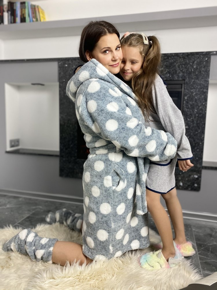 Krótki szlafrok damski z kapturem, z miękkiej dzianiny typu soft w duże kropki. Wiązany w pasie, z kieszeniami. Główną zaletą tego modelu jest cieplutka i miła w dotyku pluszowa tkanina. JEST TO PRODUKT WYSOKIEJ JAKOŚCI BARDZO DOBRZE WCHŁANIAJĄCY WODĘ !!!