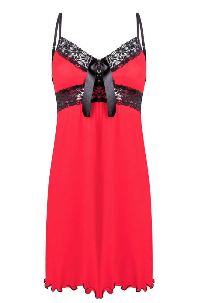 Efektowna koszulka damska z delikatnej i przyjemnej dla ciała wiskozy na cienkich ramiączkach. Z pozoru prosta, lecz tak naprawdę jest bardzo wyrafinowaną bielizną. Miseczki i pas pod biustem ozdobione elegancką czarną koronką. Na łączeniu miseczek znajduje się satynowa kokardka. Skład:  92% wiskoza, 8% elastan.