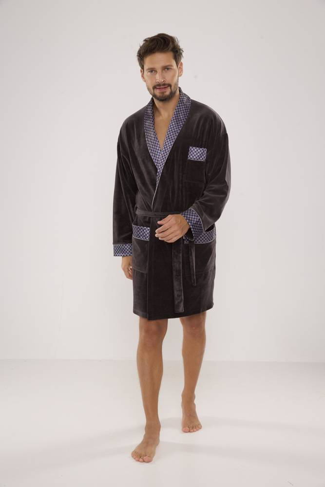 Krótki welurowy szlafrok męski, z szalowym kołnierzem, wiązany na pasek, z dwoma naszytymi kieszeniami i jedną mniejszą na wysokości klatki piersiowej. Mankiety, kołnierz i kieszenie wykończone wzorzystą satyną. Jest on wykonany z 80% bawełny przyjemnej w dotyku idealnie wchłaniającej wodę.