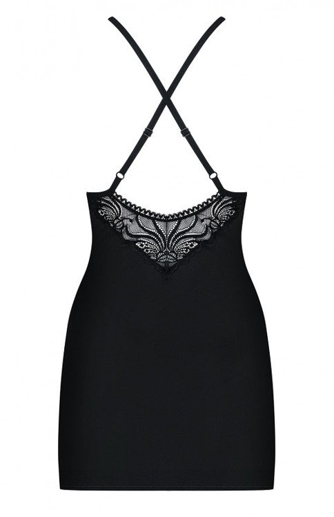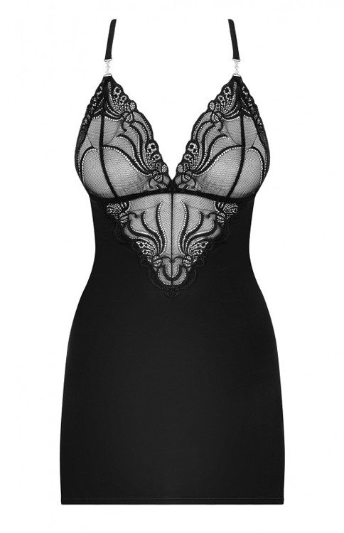 Seksowna koszulka z delikatnej tkaniny. Zmysłowy głęboki dekolt wraz z miękkimi miseczkami wykonany z ażurowej wzorzystej koronki. Cienkie ramiączka ozdobione z przodu błyszczącym elementem biżuteryjnym. Do kompletu stringi. Skład: 90% poliamid, 10% elastan.