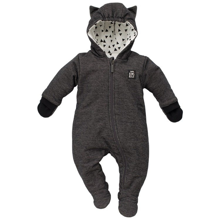 Mięciutki, trzywarstwowy kombinezon – kotek, w kolorze czarno – szarego melanżu, z bawełny 100%. Rozpinany na suwaczek po całości, w rękawkach wszyte czarne łapki. Na kapturku znajdują się kocie uszka. Podszewka bawełniana w kolorze ecru, w małe, czarne trójkąciki, nadrukowane bezpieczną metoda farby wodnej.