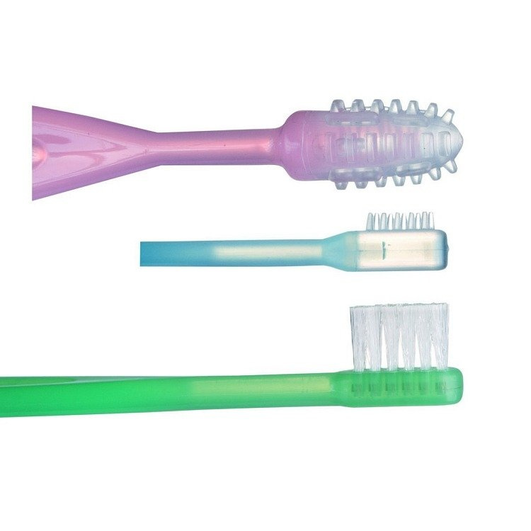 Zestaw do masażu dziąseł i mycia pierwszych ząbków malucha składa się z trzech szczoteczek: