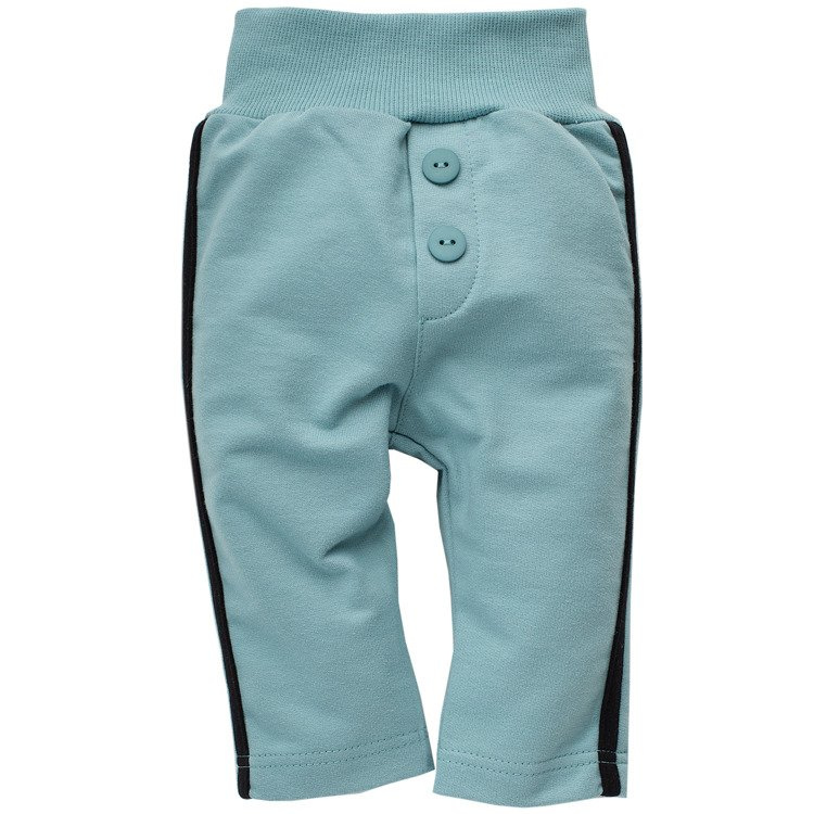 Zapytaj o produktWygodne, przyjemne spodnie w kolorze turkusu, wykonane ze 100% bawełny. Czarne paski po bokach ubranka wprowadzają miłe urozmaicenie w kolorystyce, Szerokie ściągacze w pasie i na nóżkach zapewniają odpowiednie przyleganie, jednocześnie nie krępując ruchu dziecka i nie powodując u niego poczucia dyskomfortu. Od rozmiaru 74 wzmocnione gumką w pasie.