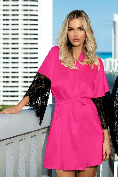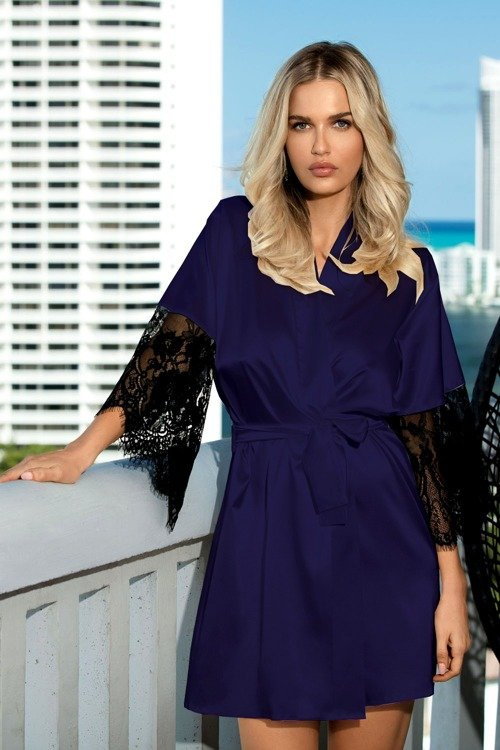 Kusząca, a zarazem elegancka satynowa podomka, która powinna się znaleźć w garderobie każdej kobiety. Połączenie rękawów o długości 3/4 z szeroką koronką dodaje lekkości i kobiecości. Szlafrok zalotnie wiązany w pasie, wykończony dołem na półokrągło – romantyczny i jednocześnie niesamowicie zmysłowy.
