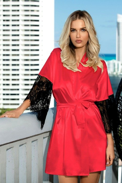 Kusząca, a zarazem elegancka satynowa podomka, która powinna się znaleźć w garderobie każdej kobiety. Połączenie rękawów o długości 3/4 z szeroką koronką dodaje lekkości i kobiecości. Szlafrok zalotnie wiązany w pasie, wykończony dołem na półokrągło – romantyczny i jednocześnie niesamowicie zmysłowy.