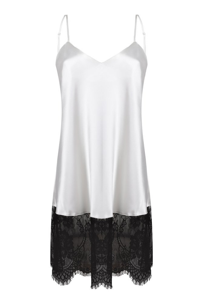 Efektowna koszulka damska z delikatnej i przyjemnej dla ciała satyny na cienkich ramiączkach. Z pozoru prosta, lecz tak naprawdę jest bardzo wyrafinowaną bielizną. Dół koszulki ozdobiony elegancką czarną koronką.